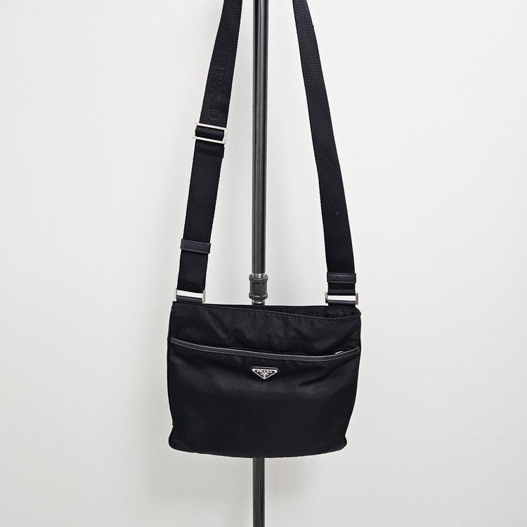 프라다의 포코노 재질의 메신저백으로 어떤 코디에나 활용하기 좋은 크로스백입니다.